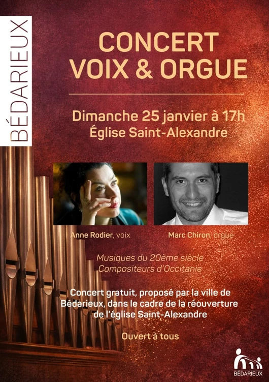 Concert voix et orgue à l’occasion de la réouverture de l’église Saint-Alexandre. La soprano Anne Rodier et l’organiste toulousain Marc Chiron se réunissent…