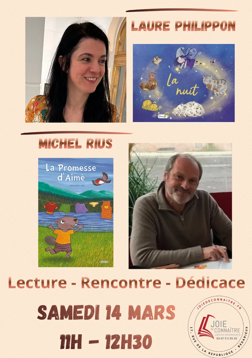 Séance de dédicace exceptionnelle – Auteurs jeunesse d'ici Nous avons le plaisir d’accueillir Laure Philippon et Rius Michel Mic pour une séance de dédicace pleine de bonne humeur !Le 14 marsn de 11h à 12h30Grenouille Editions - La nuitUtopique éditions - La promesse d'AiméDeux auteurs passionnés, adorables, toujours souriants et d’une grande gentillesse Leur univers fait rêver les enfants… et leur rencontre est un vrai moment de bonheur !Les enfants, venez les rencontrer !Vous allez les adorer !!Un beau moment d’échange, de sourires et de découvertes vous attend