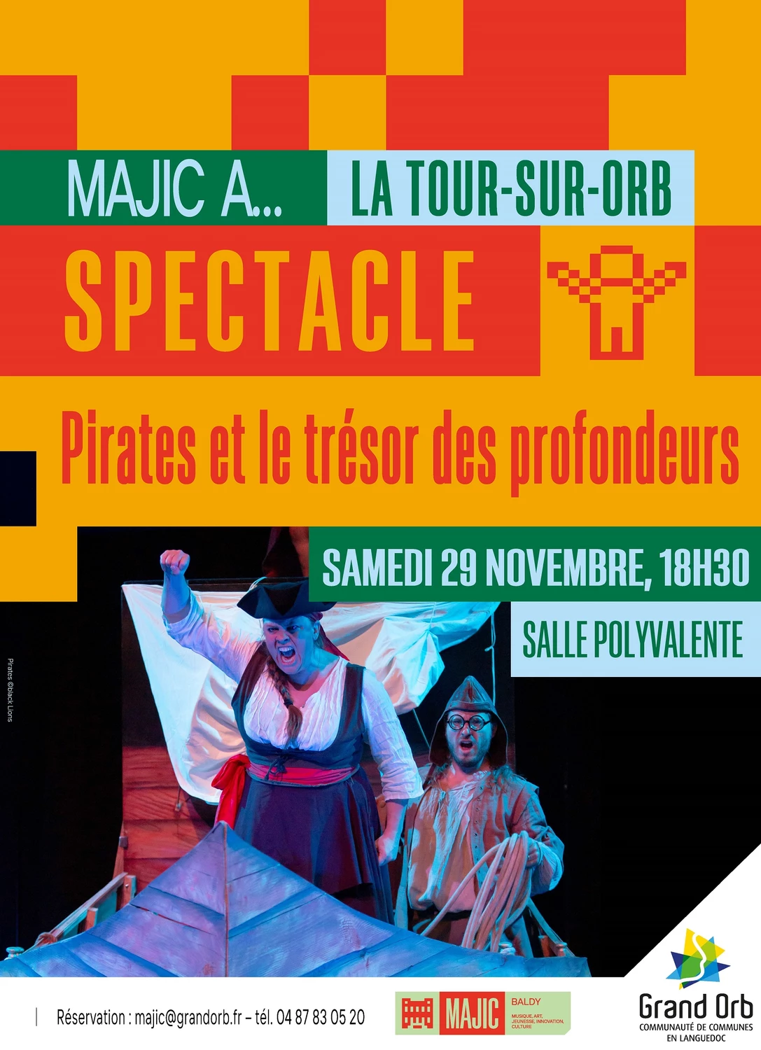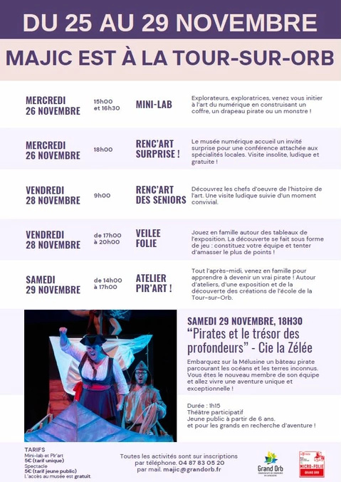 Une semaine par mois l’équipe MAJIC quitte le château Baldy à Bédarieux pour s’installer dans une commune du territoire Grand Orb. Pour cette première semaine en itinérance, les agents d’animation et de médiation culturelle de la communauté de communes accueilleront le public à La Tour-sur-Orb du mercredi 25 au samedi 29 novembre. Les rendez-vous feront la part belle au monde des pirates et des monstres en lien avec l’art, la création numérique et le spectacle vivant.