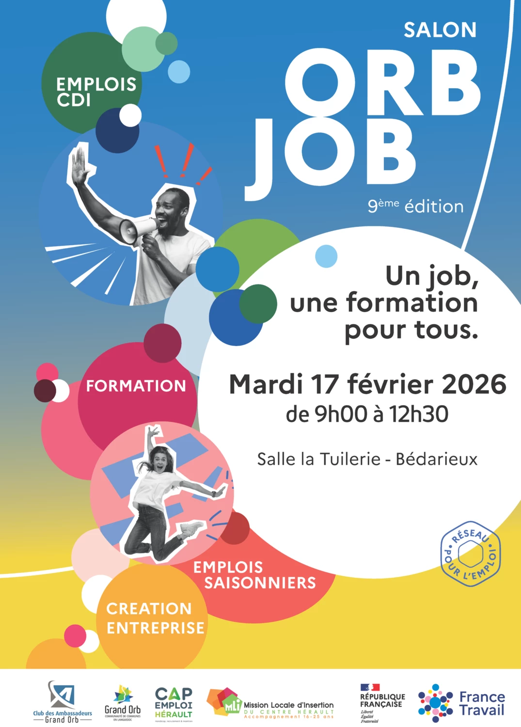 C’est LE rendez-vous du recrutement en Grand Orb ! Proposé par France Travail, la Communauté de communes Grand Orb et le Club des Ambassadeurs, le forum « Orb Job » revient pour sa 9ème édition mardi 17 février 2026 à La Tuilerie à Bédarieux.