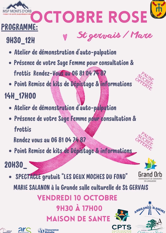 A l'occasion d'Octobre Rose, les aceturs de la santé du territoire se mobilisent et vous accueillent à la Maison de santé de Saint Gervais-sur-Mare, 2 impasse des Treilles, vendredi 10 octobre de 9h30 à 17h.