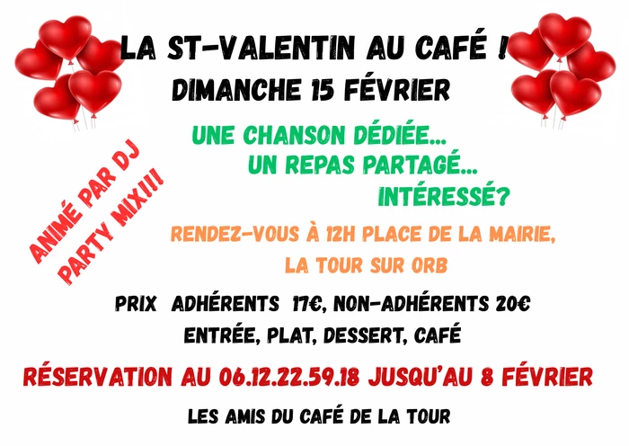 Comme chaque année, nous célébrerons la Saint-Valentin avec un bon repas (entrée plat et dessert) et au rythme de musiques mixtes et mixées.