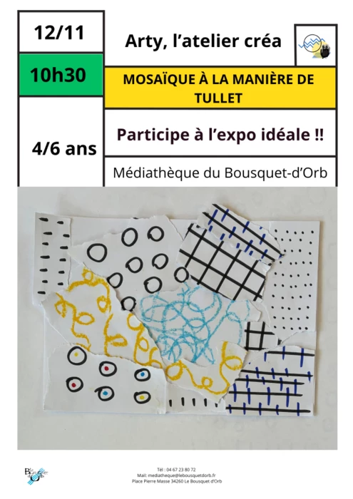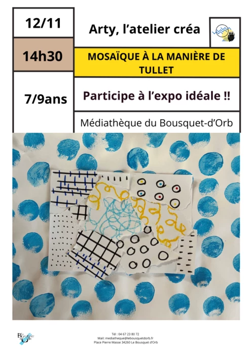 Au programme : choix /création de motifs (ronds, gribouillis, traits, cercles, etc.) puis on déchire, on colle ! Du bleu, du jaune, du rouge et du noir et blanc. Ces ateliers sont programmés dans le cadre de l'Expo idéale qui aura lieu à l'Espace d'Art Contemporain de Bédarieux au mois de mai en partenariat avec les bibliothèques de Bédarieux et des Aires. Toutes les créations seront donc exposées pour cette occasion !
