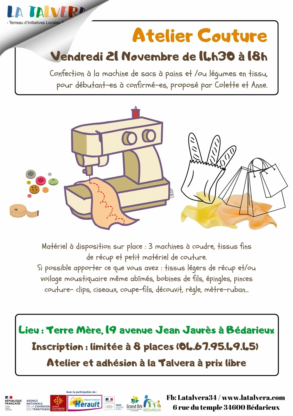 Matériel à disposition sur place : 3 machines à coudre, tissus fins de récup et petit matériel de couture.