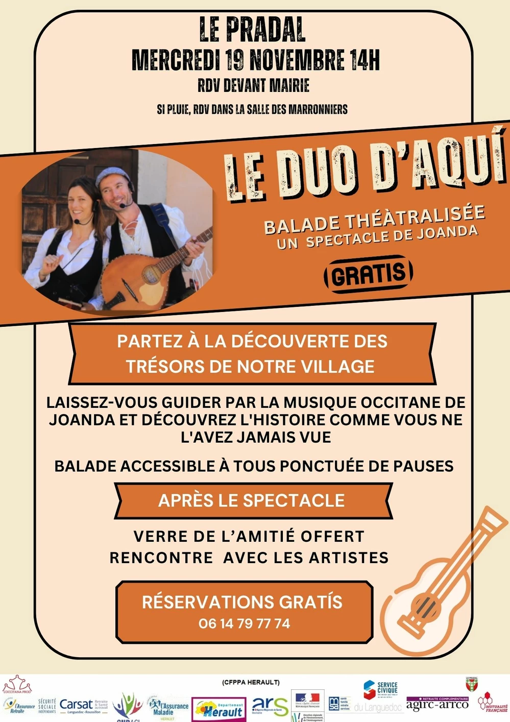 Mercredi 19 novembre à 14h, le Duo d’Aquí, avec l’artiste occitan Joanda et la comédienne Valentine Dufloo, mettra en lumière l’histoire et le patrimoine du Pradal. Un spectacle qui va guider les visiteurs dans les rues du cœur de village autour de tableaux inattendus.