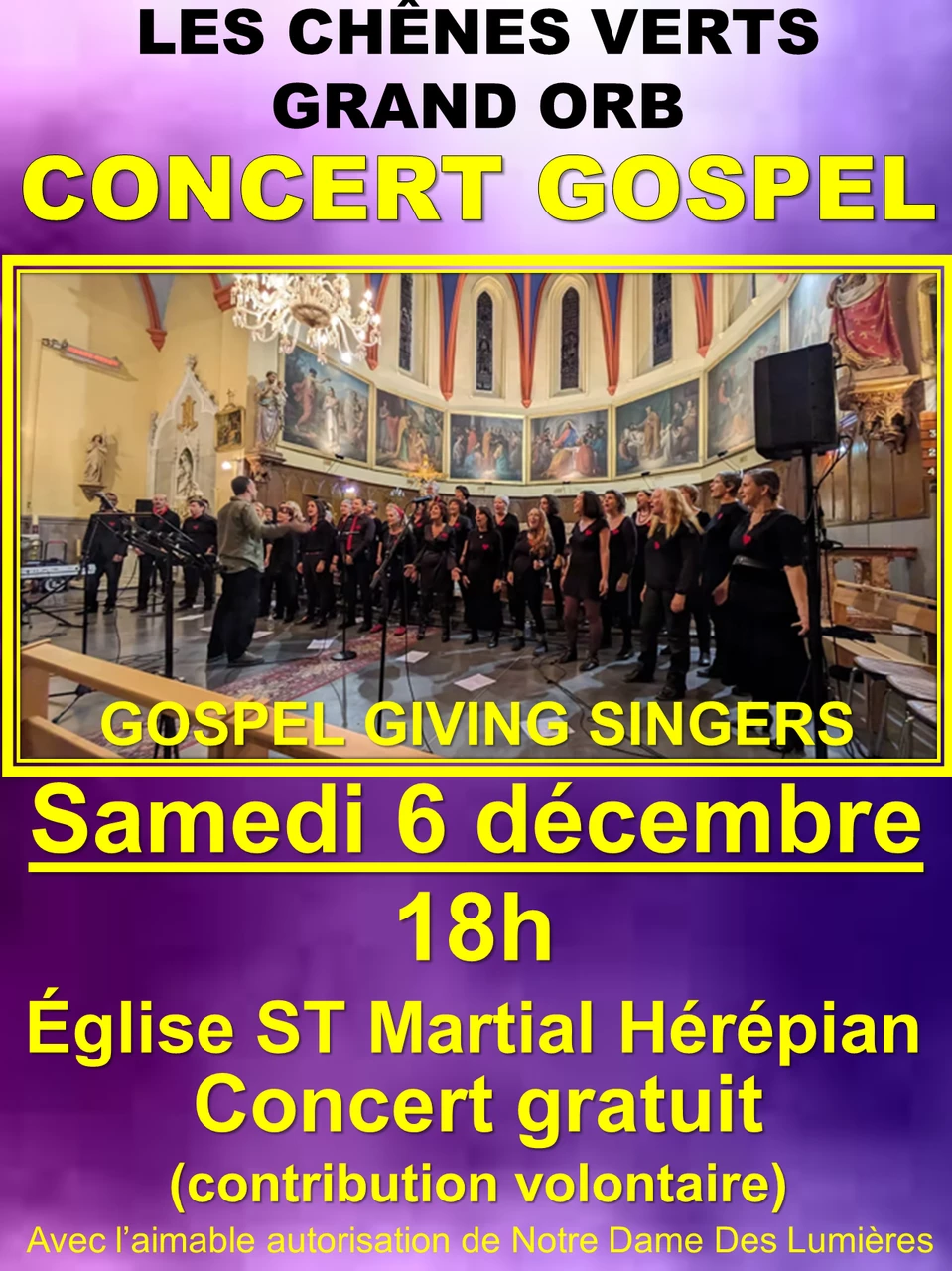 Concert GOSPEL GIVING SINGERS proposé par l'association Les Chênes Verts Grand Orb samedi 6 décembre à 18h à l'église Saint Martial d'Hérépian.