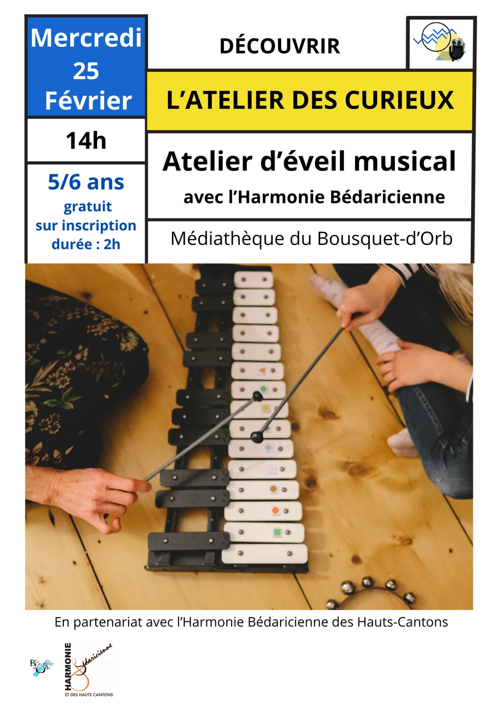 En partenariat avec l'Harmonie Bédaricienne des Hauts-Cantons, la médiathèque propose aux enfants de venir découvrir des instruments et de s'initier à la musique. Un moment ludique entre écoute et pratique musicale permettant aux enfants d’aller à la rencontre de cet univers grâce à des intervenants pédagogues et passionnés.
