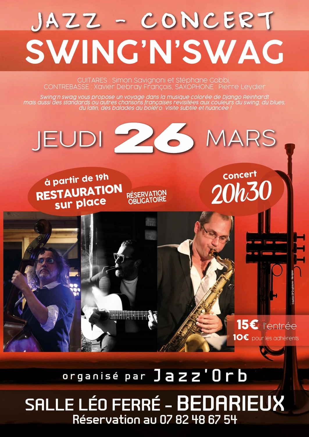 L'association Jazz'Orb organise un concert le jeudi 26 Mars 2026 à la salle Léo Ferré à Bédarieux avec le quartet "Swing'n Swag" à 20h30.
