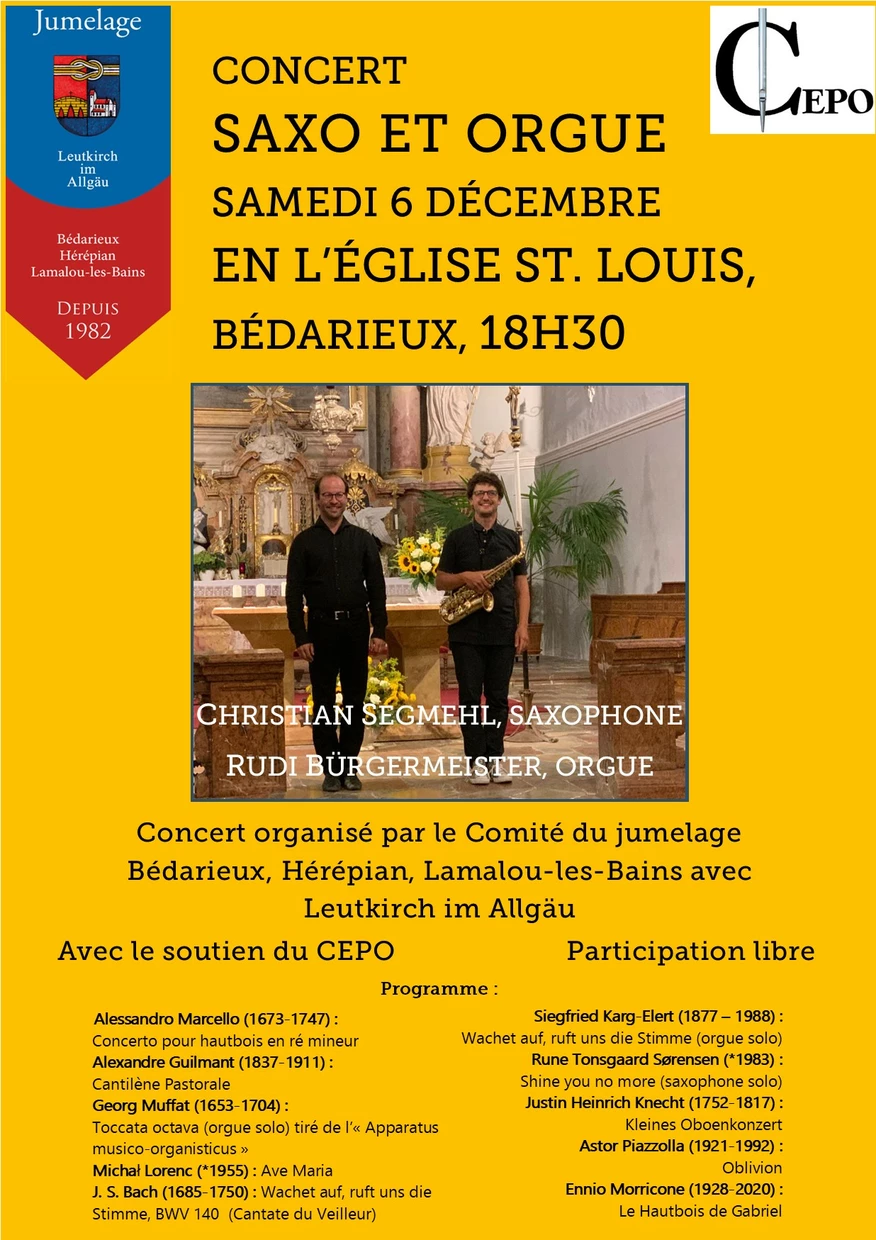 Concert Saxo et Orgue, le samedi 6 décembre en l’église St. Louis à Bédarieux à 18h30. Participation libre. Organisé avec le soutien du CEPO. Renseignements auprès du Comité de jumelage avec Leutkirch im Allgäu : 06 08 63 27 20.