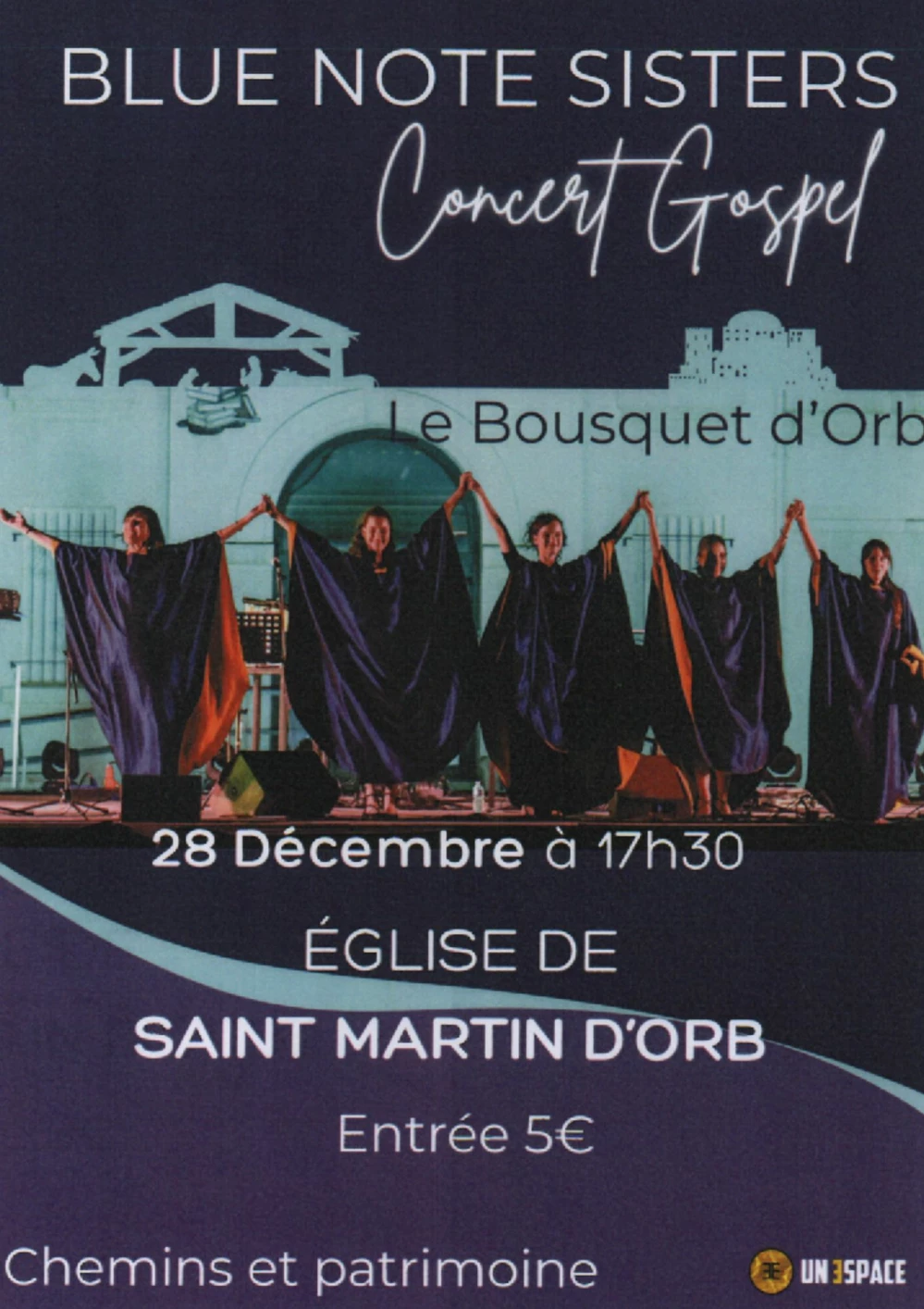 L'association Chemins et patrimoine invite le Gospel Blue Note Sisters dimanche 28 décembre à 17h30 à l'église de Saint-Martin d'Orb.