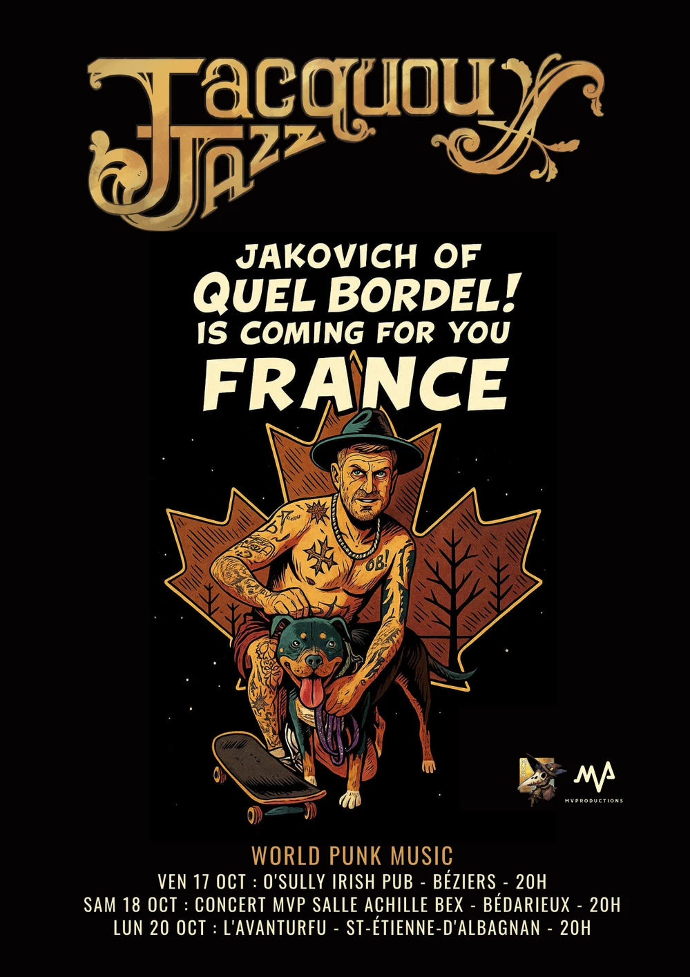 Jacquou Jazz, c’est la rencontre explosive entre Jakovich (de QUEL BORDEL) et Fabi (de BandàpArt), pour une tournée inédite mêlant les univers de QUEL BORDEL, de BandàpArt et du super-groupe BandàBordel.