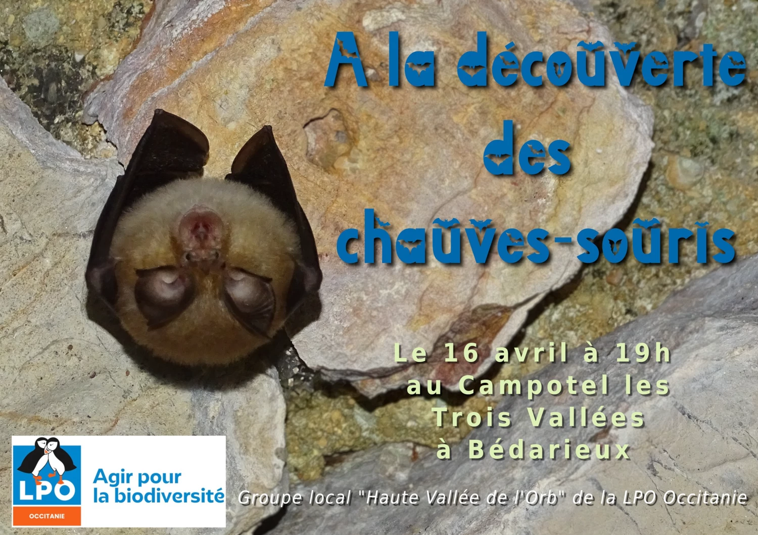 «Le Monde extraordinaire des chauves-souris» animé par Camille Fraissard, salarié de la LPO Occitanie chargée de missions nature et biodiversité. La conférence sera suivie d'un film " Une vie de grand Rhinolophe ", d'un échange d'idées et une petite sortie pour mieux connaître ces mammifères remarquables.