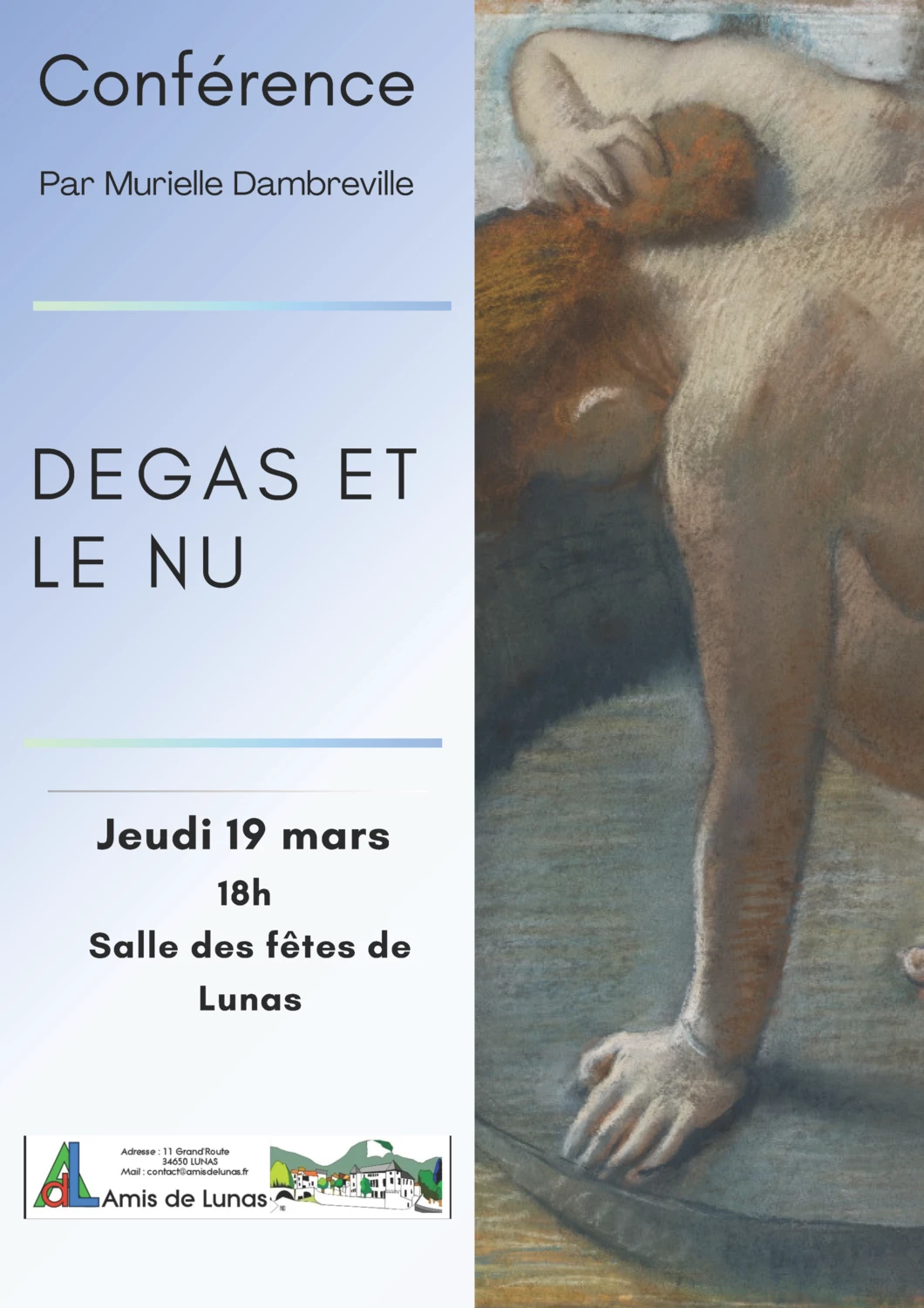 Conférence organisée jeudi 19 mars à 18h à la salle des fêtes par l'association des Amis de Lunas : Degas et le nu.