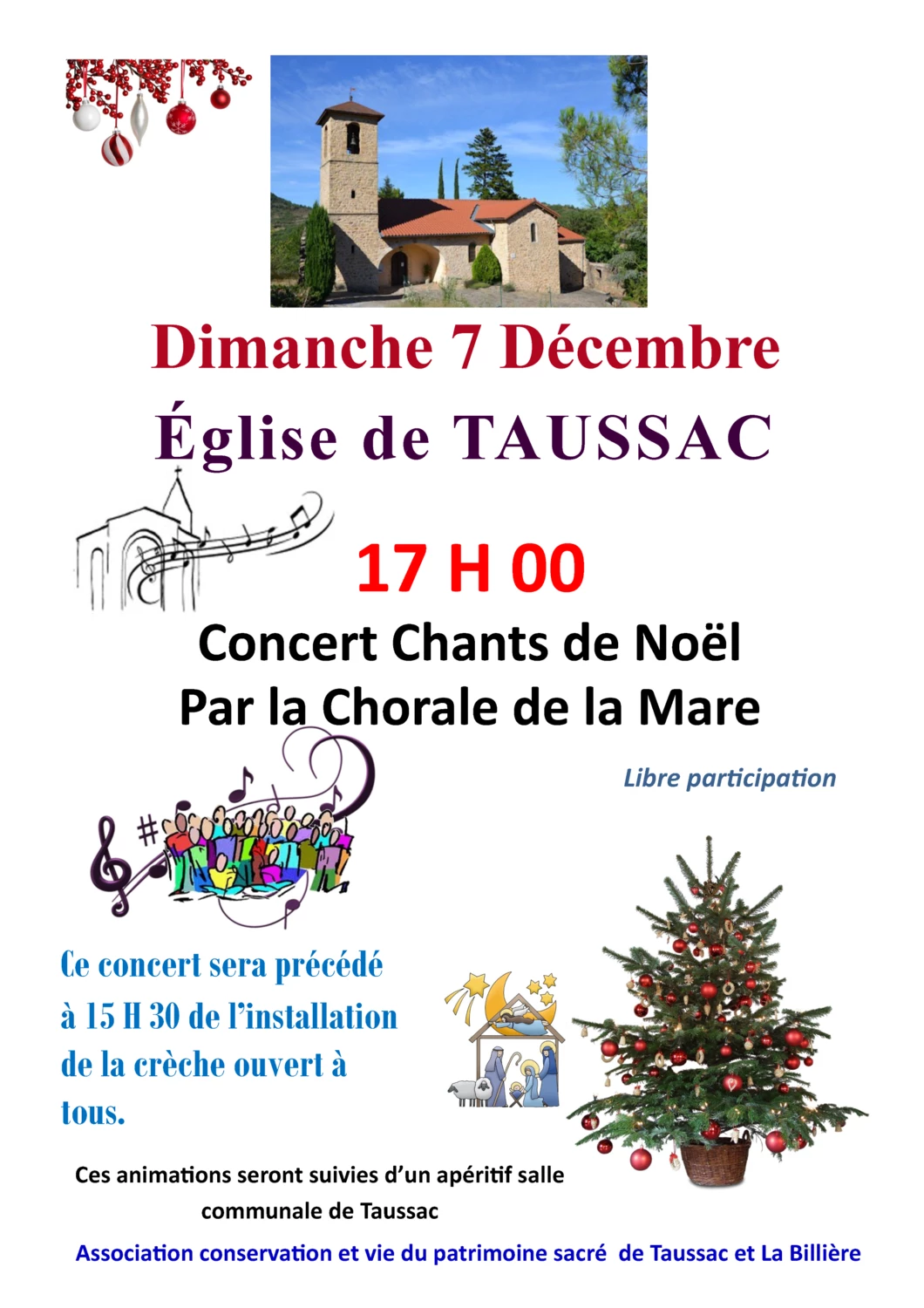 Concert Chants de Noël par la Chorale de la Mare à 17h à l’église de Taussac.