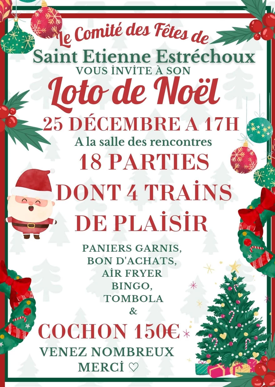 Loto de Noël organisé par le Comité des fêtes de Saint Etienne Estréchoux à 17h à la salle des rencontres.