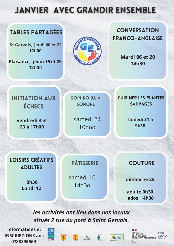 Atelier proposé par l'espace de vie sociale Grandir Ensemble à Saint Gervais-sur-Mare.Rendez-vous 2 rue du Pont.Informations et inscriptions : 07 88 39 55 69. Nombre de places limité.