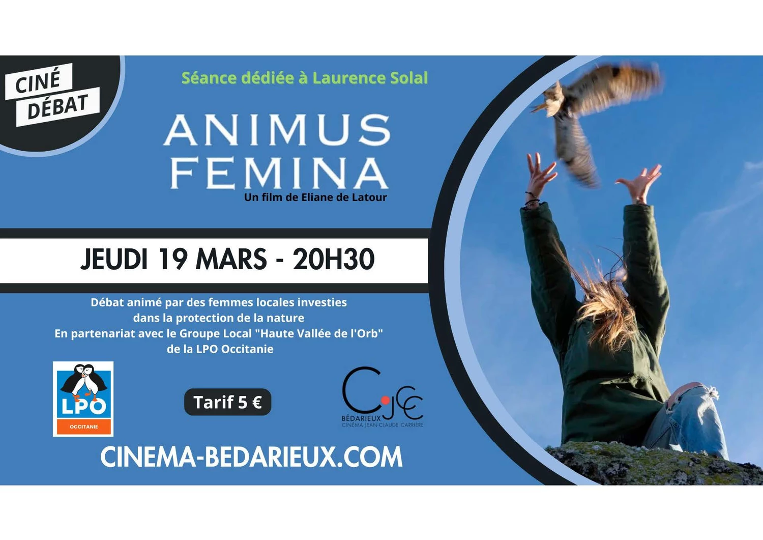 Ciné-débat au cinéma de Bédarieux, tarif 5€. En partenariat avec la LPO.« Animus Fémina » un film d’Éliane de Latour. Séance dédiée à Laurence Solal.115 ans après la première Journée internationale des droits des femmes, le groupe local vous invite à ce documentaire à la fois poétique et bouleversant qui suit le combat quotidien de quatre femmes engagées pour la défense du vivant. Marie-Pierre Puech, vétérinaire et fondatrice de l’Hôpital de la faune sauvage dans les Cévennes, Sara Labrousse, océanologue engagée pour le climat et les manchots et phoques en Antarctique, Francine Géniaux, qui vit isolée dans une zone réensauvagée des Asturies et enfin, Isis Olivier, artiste-peintre animalière : quatre tisseuses de mondes nous invitent à décentrer nos regards et repenser les façons d’habiter le monde avec force et poésie.Le débat sera animé par des femmes locales investies dans la protection de la nature.